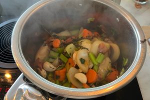 2. Voeg de verse kruiden, bosuitjes, laurierblaadjes en peperkorrels toe. Roer goed door. Voeg vervolgens de bleekselderij, wortelen, prei en knoflook toe en roer opnieuw.