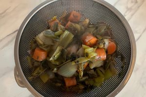 4. Laat de bouillon afkoelen en zeef vervolgens de groenten, peperkorrels en kruiden eruit. Bewaar de bouillon daarna voor 2 weken in glazen potten in de koelkast, of giet het in ijsblokvormpjes en bewaar het in de vriezer.
