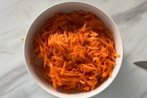 1. Spoel en rasp de wortels en doe het in een bakje. Spoel ook de kikkererwten goed af en dep deze droog met een theedoek.