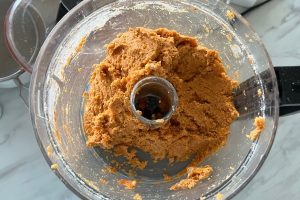 2. Snijd de ui en knoflook in stukken. Doe ze samen met de geraspte wortel, kikkererwten, havermout, tomatenpuree, kruiden en walnoten in de keukenmachine en mix het tot een stevige massa. Je zou er nu makkelijk burgers van moeten kunnen maken. Is het te plakkerig? Voeg dan extra havermout toe.