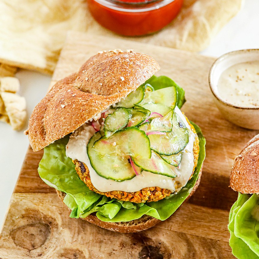 6. Snijd de broodjes open en besmeer ze met jouw favoriete saus. Leg er de burgers op en voeg jouw favoriete toppings toe. Serveer met (zoete) aardappel frietjes en/of een salade.