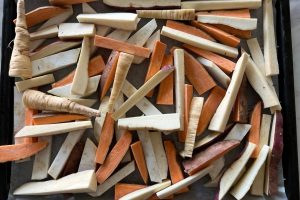 2. Schil de zoete aardappel, pastinaak en knolselderij en snijd ze in frietjes van ongeveer 1 cm dik.