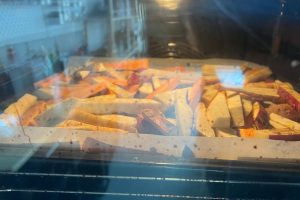 4. Verspreid de frietjes over de bakplaat en zet deze in de oven. Rooster 15-20 minuten.