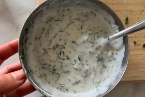 6. Terwijl de groenten in de oven zitten, maak je de kruidensaus. Meng in een kommetje de plantaardige yoghurt, olijfolie, knoflook, peterselie, dille, citroensap, zout en peper. Roer goed door en zet de saus minimaal 10 minuten in de koelkast.