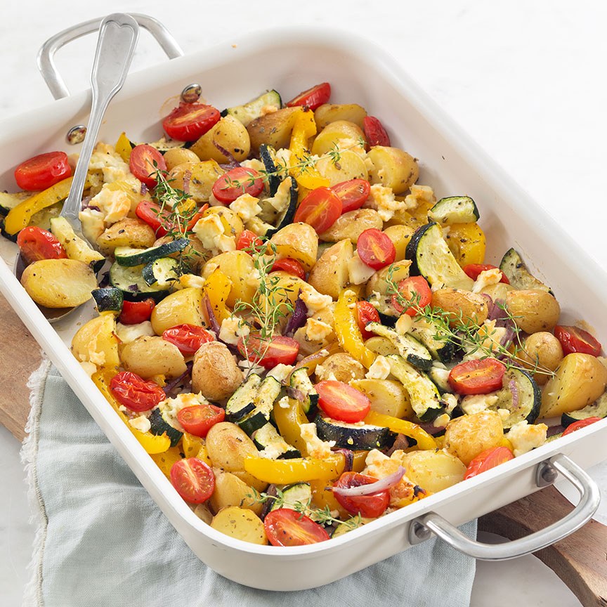 6. Kruimel de feta erover en zet vervolgens 15 minuten in de oven. Doe daarna de gehalveerde cherrytomaatjes erbij en zet nogmaals 5 tot 10 minuten in de oven tot de groenten en de aardappels gaar zijn.