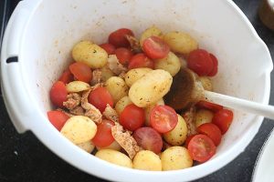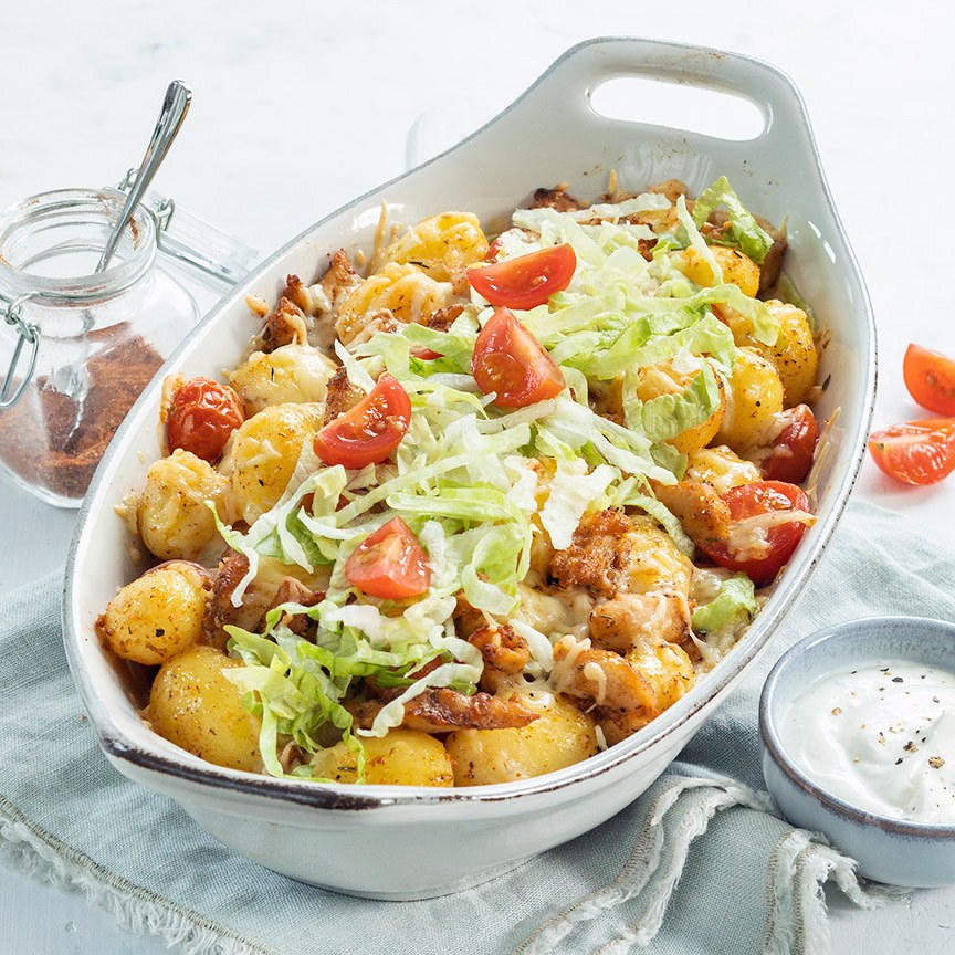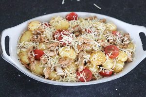 2. Giet de aardappels af en schep ze ook door het gyros vlees. Halveer de tomaatjes en schep er ook door. Doe alles in een ingevette ovenschaal. Bestrooi met wat kaas en zet de ovenschotel 20 minuten in de oven.