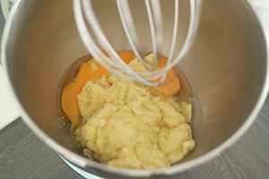 1. Verwarm de oven op 200 graden. Doe het water in een pannetje en verwarm deze. Voeg de boter toe en laat hierin oplossen. Voeg dan de bloem toe en een snufje zout en schep met een houten lepel door elkaar tot er een bal ontstaat. Laat dit deeg nog een paar minuten op zacht vuur garen.