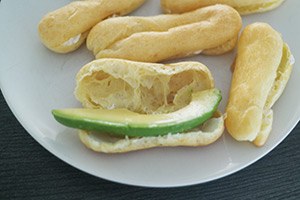2. Knip de eclair met een schone keukenschaar voorzichtig open (met snijden druk je ze makkelijk kapot). Besmeer de onderzijde met een laagje roomkaas. Snijd de avocado doormidden, verwijder de pit en schil en snijd het vruchtvlees in dunne plakjes. Beleg de onderzijde van de eclairs hiermee en leg er een stukje zalm op. Leg vervolgens de bovenzijde van de eclair er op.