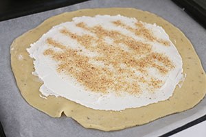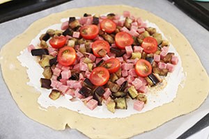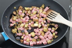 2. Snijd ondertussen de aubergine in blokjes en bak deze aan in een pan met een scheutje olie. Voeg de hamblokjes toe en breng op smaak met een snuf peper en zout. Bak 5 minuutjes en laat daarna uitlekken op een keukenpapiertje. Haal het deeg uit de folie en rol eventueel met een beetje bloem op de bakplaat uit tot een lap deeg.