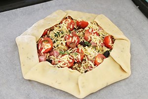 3. Verdeel de ricotta over het midden en bestrooi met een beetje paneermeel om het vocht op te nemen. Verdeel het aubergine-ham mengsel hierover. Halveer de tomaatjes en verdeel deze ook over het mengsel. Bestrooi met wat kaas. Vouw de randen naar binnen iets over de vulling en overlappend over elkaar. Klop het ei los en bestrijk de bovenzijde van het deeg hiermee. Bak de galette ca 40 min in de oven. Lekker met een salade of een kopje soep.
