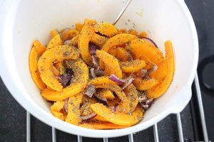 1. Verwarm de oven op 210° graden. Schil de pompoen en snijd deze eerst in stukken en daarna in dunne plakjes ca. 5 mm dik. Maak ze niet veel dikker, anders worden ze niet goed gaar. Snijd de ui in ringetjes. Meng de pompoen schijfjes en rode ui in een kom met een lepel olie, kneepje honing, tijm, peper en zout.