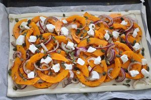 2. Rol het bladerdeeg uit op een bakplaat en vouw de randjes om. Prik met een vork gaatjes in de bodem. Kruimel de helft van de geitenkaas over de bodem en verdeel hierop het pompoenmengsel. Kruimel vervolgens de rest van de geitenkaas erover en bestrooi het geheel met pompoenpitten.