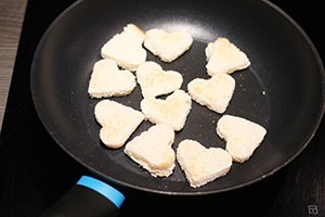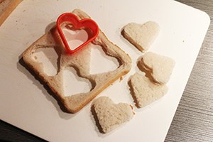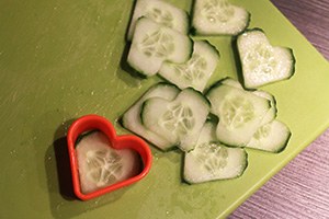 1. Snijd de komkommer in plakjes en druk met de hartjes steker vormpjes hier uit. Mocht je er geen in huis hebben dan kun je ze ook met een mesje in een hartjes vorm snijden. Druk ook vormpjes uit het brood en toast deze kort in een droge pan of in de oven krokant. Snijd de aardbeien en avocado in plakjes.