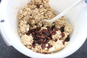 5. Hak de amandelen fijn en roer ook door het mengsel, eventueel met nog wat rozijnen.
