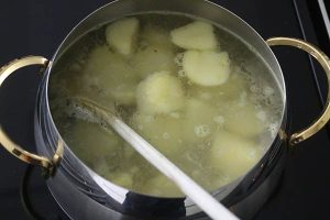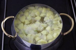 1. Snijd de aardappels in grove stukken. Schil de appels, pel de ui en snijd beide in stukjes. Verhit een pan met water op het vuur. Voeg de aardappels en ui toe, en na 5 minuten de appel. Kook in totaal ca. 15 minuten tot de aardappels gaar zijn.