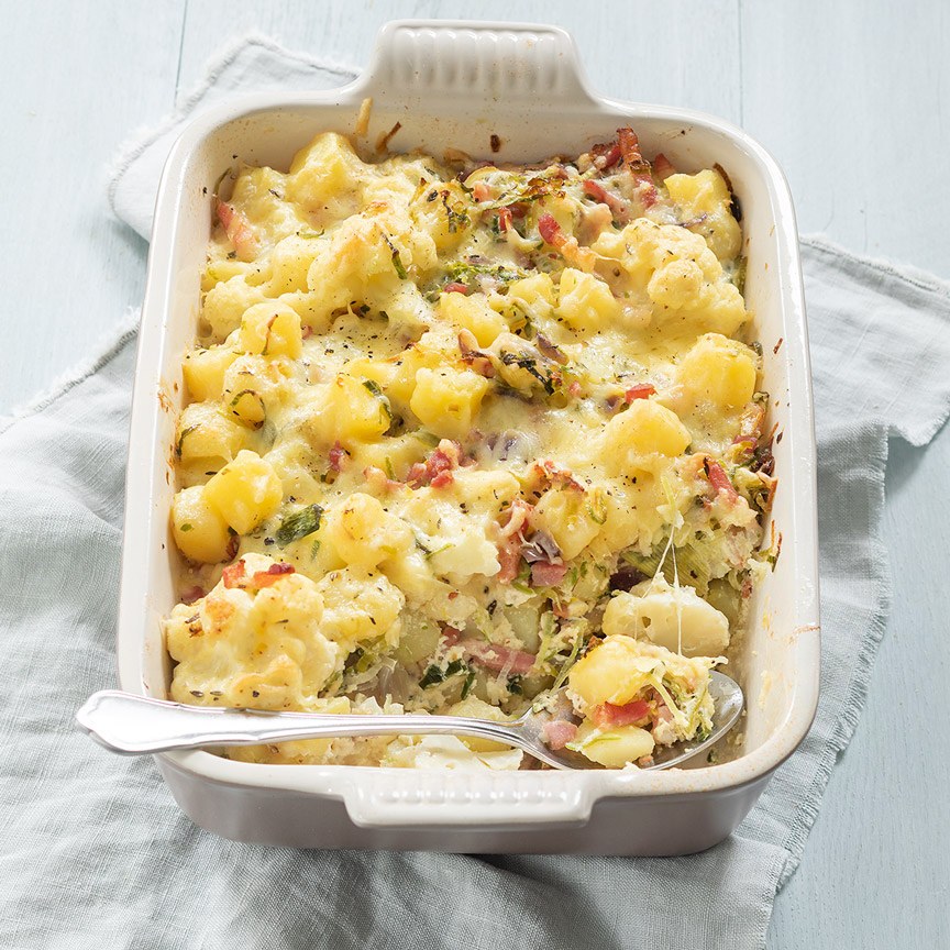 1. Verwarm de oven op 200 graden. Kook de bloemkool en krieltjes 5 minuten voor, dit kan eventueel samen. Giet daarna af. Bak de spekjes met de fijngesnipperde rode ui in een pan en als ze iets krokant zijn voeg je de prei toe.