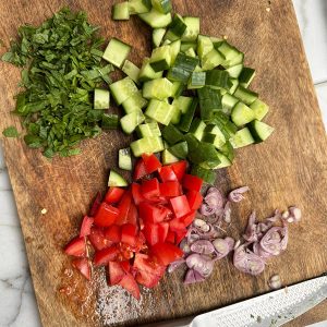 1. Snijd de komkommer en tomaten in blokjes. De rode ui snipper je fijn en de verse munt hak je fijn.