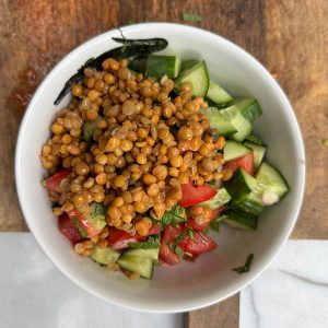 3. Meng in een schaaltje de komkommer, tomaat, rode ui, verse munt, sap van ½ citroen en de linzen.