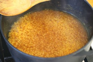 1. Was de linzen goed en laat 10 minuten weken in koud water. Was nogmaals goed en voeg de linzen samen met 1 liter water, kurkuma en zout in een pan. Breng aan de kook en kook voor ongeveer 15-20 minuten of tot de linzen zacht zijn.
