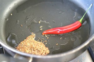 2. Neem een andere pan, voeg 2 eetlepels zonnebloemolie toe, bak de chili ongeveer 3 minuten aan. Voeg de komijnzaadjes toe, bak 2 minuten, verwijder de chili, maar bewaar deze voor de garnering. Voeg na 1 minuut de uien toe en als deze glazig zijn, geraspte gember en gehakte knoflook. Voeg na 2 minuten tomatenpuree en tomatenblokjes toe.