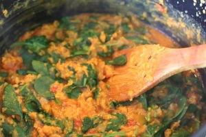 3. Laat dit op laag vuur 10 minuten pruttelen. Meng het tomatenmengsel met de linzen, voeg garam masala toe en als laatste spinazie en gehakte koriander. Serveer de dahl met naanbrood en een beetje romige kokosmelk.