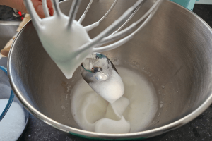 3. Splits de eieren en klop de eiwitten op met een handmixer of keukenmixer. Zodra er lobbige pieken ontstaan, voeg je de suiker beetje bij beetje toe.