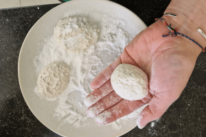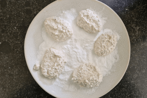 8. Rol ieder hoopje beslag door de poedersuiker en rol er dan losjes in je handen een bolletje van. Dit hoeft niet te netjes. Rol dit bolletje eventueel nog een keer door de poedersuiker als het nog te veel plakt.