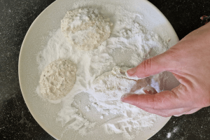6. Zet een bakplaat met bakpapier klaar. Neem een schaal of bord en bestrooi royaal met poedersuiker.