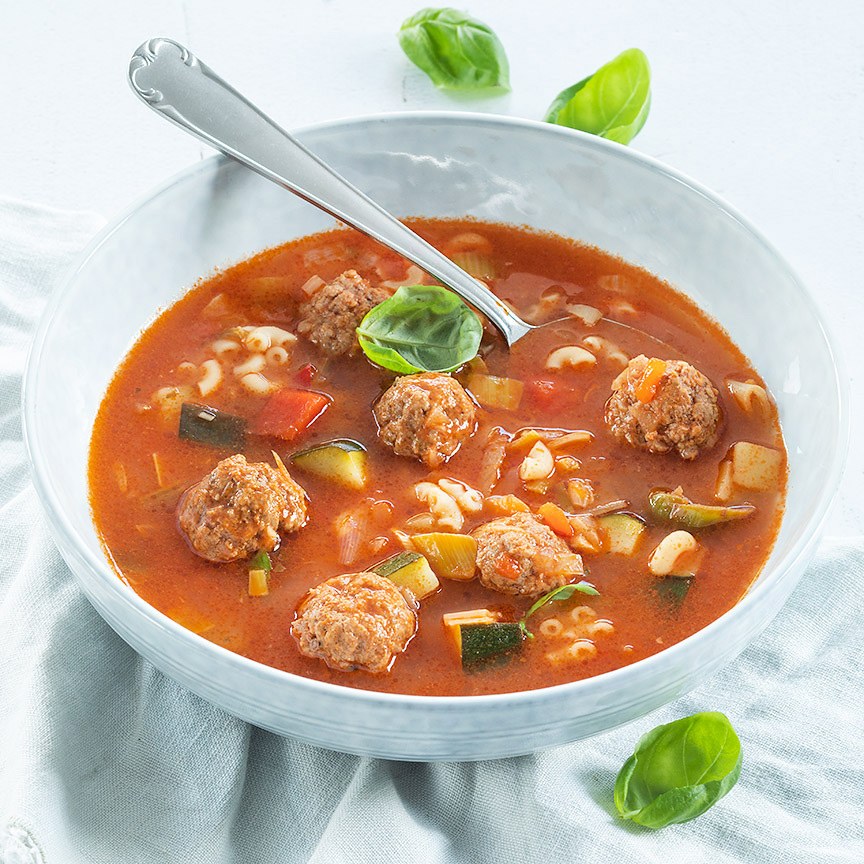 2. Schep dan de tomatenpuree en de Italiaanse kruiden erbij en bak ook 2 minuten mee. Snijd de paprika en courgette in stukjes. Voeg dan de groenten toe aan de pan en roerbak ongeveer 5 minuten. Schenk de bouillon erbij en laat de gehaktballetjes voorzichtig in de soep vallen.