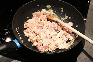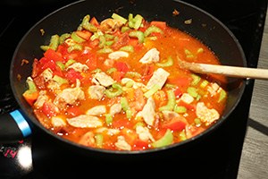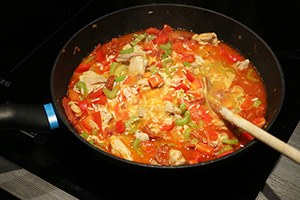 1. Snipper de ui en knoflook en fruit deze aan in een grote (wok)pan. Snijd de kip in stukjes en voeg toe en bak rondom aan. Voeg de cajunkruiden en paprikapoeder toe. Snijd de paprika en tomaten in blokjes en de bleekselderij in plakjes. Voeg deze groenten samen met de chorizo toe aan de kip.
