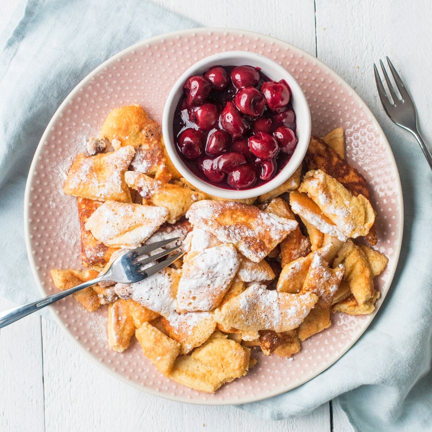 Kaiserschmarrn is een Oostenrijks gerecht dat een beetje doet denken aan pannenkoeken, maar dan zoeter en extra luchtig. Als je wel eens op wintersport bent geweest, heb je ze ongetwijfeld al eens gezien (of gegeten). Kaiserschmarrn worden vaak gegeten als ontbijt of als lunch, maar als avondeten kan ook. En je serveert Kaiserschmarrn in stukjes, vaak met poedersuiker, compote of appelmoes er naast. Of ga net als ik voor warme kersen, aanrader!