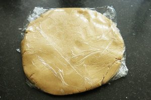 4. Wikkel het deeg in een stuk plasticfolie en leg een half uurtje in de koelkast. Als het deeg koud is dan krijg je een extra knapperig resultaat en is het makkelijker te bewerken.