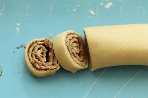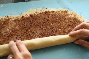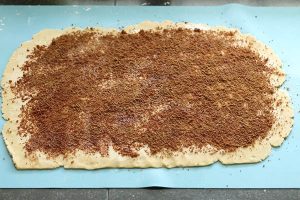 9. Bestrooi de kaneelsuiker erover en rol de lap deeg stevig op via de lange kant.