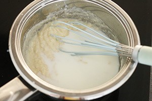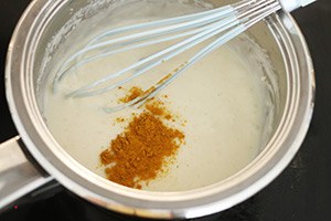 1. Smelt de boter in een pannetje en voeg de bloem toe. Bak het mengsel (de roux) 2 minuutjes zodat deze kan garen. Schenk beetje bij beetje de melk er bij en roer met een garde glad. Roer op het laatst de kerrie en peper en zout er door.