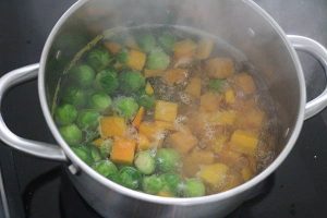 3. Breng een pan met water aan de kook. Kook de spruitjes en pompoen ca. 8 minuutjes voor en giet daarna af.