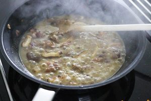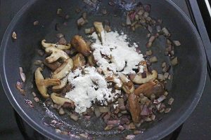 5. Snijd de paddenstoelen in plakjes en bak even mee.