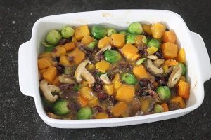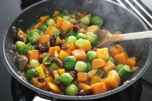7. Doe de spruitjes, cranberry en pompoenblokjes bij de saus in de pan. Breng het mengsel op smaak met tijm.