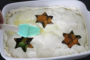 9. Als je losse velletjes bladerdeeg gebruikt dan druk je deze aan elkaar tot 1 grote lap. Druk er een paar sterren uit met een koekjesvorm en plak deze op een ander stuk. Leg dan het deeg op de vulling in de schaal en duw de randen een beetje naar binnen.