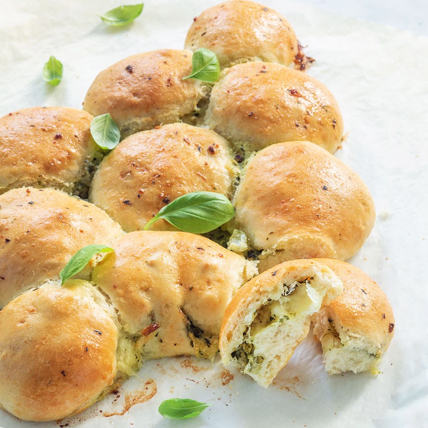 3. Haal het deeg uit de kom en kneed nogmaals goed door. Draai 11 balletjes van het deeg. Rol of druk deze plat en leg een paar stukjes mozzarella en een theelepel pesto in het midden. Vouw heel goed dicht en rol weer tot een balletje. Herhaal met de rest.