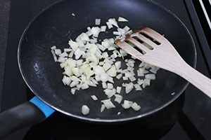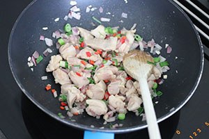 1. Snijd de kip in stukjes. Snipper de ui, rode peper en knoflook en bak in een (wok)pan met een beetje sesamolie. Voeg de kip toe.