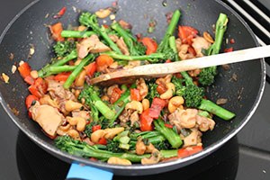 3. Laat het mengsel ca. 10 minuten zachtjes bakken. Bereid de rijst. Roer de cashewnoten door de wok en bak nog een paar minuutjes mee. Serveer de rijst met de kip-cashew-bimi-roerbak.