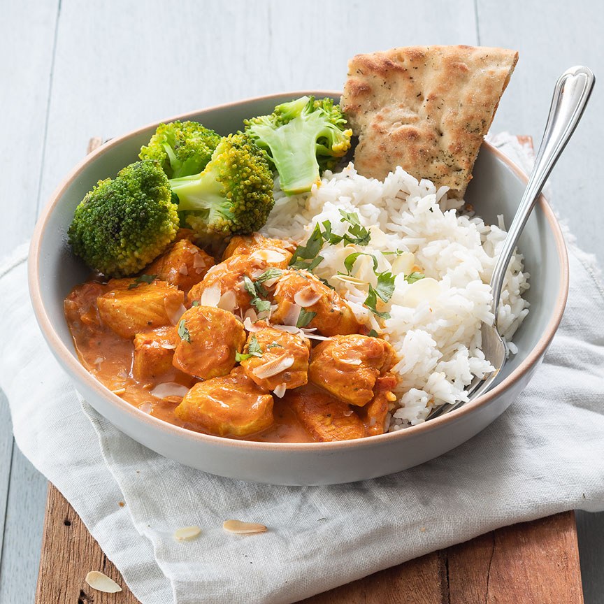3. Serveer de kip korma op een bord of in een kommetje en bestrooi met de amandelen. Lekker met rijst, sperzieboontjes en zelfgemaakt naanbrood bijvoorbeeld.