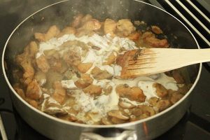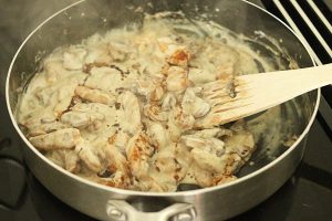 9. Giet dan de bouillon er beetje bij beetje bij en blijf ondertussen goed roeren. Laat de saus iets indikken.