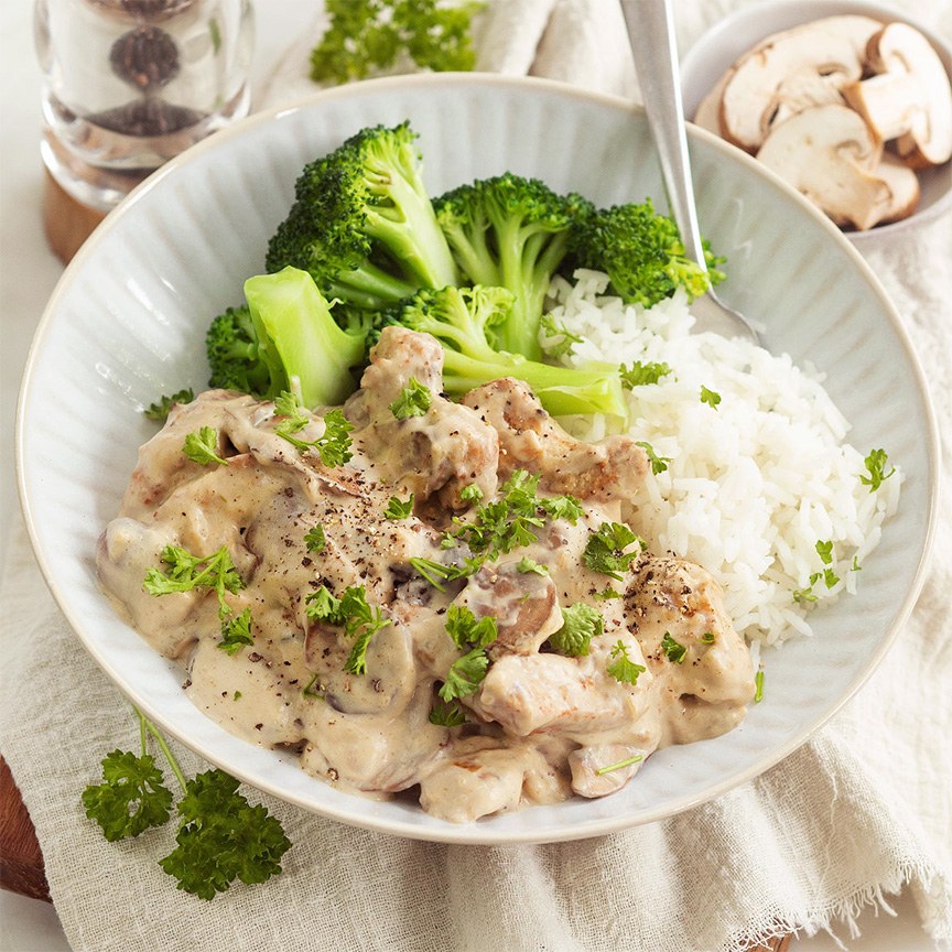 12. Serveer de kip in champignonroomsaus met rijst en broccoli. Garneer met wat peterselie.