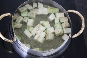1. Schil de aubergine en snijd in stukjes. Kook deze in een pan met water 10 minuutjes tot deze zacht is. Laat uitlekken en dep goed droog met keukenpapier en hak de aubergine nog iets fijner.