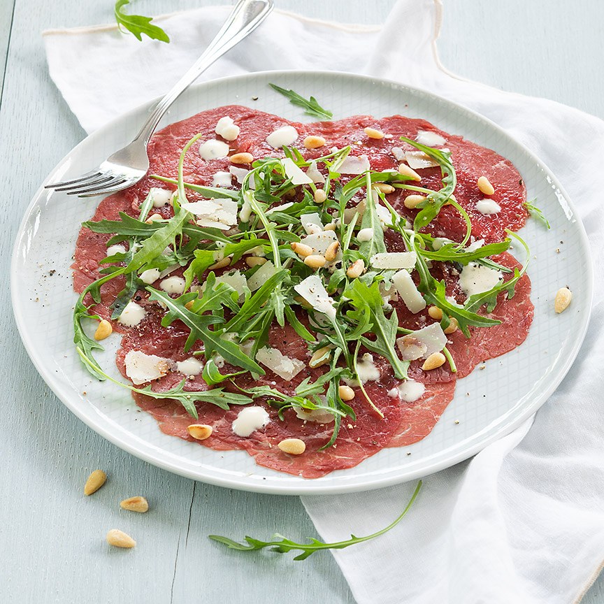 1. Verdeel de carpaccio over 4 borden. Verdeel een beetje rucola er over en garneer met wat pijnboompitten en Parmezaanse kaas. Bestrooi met een snufje peper en zout en druppel er een beetje truffelsaus of mayo over.