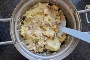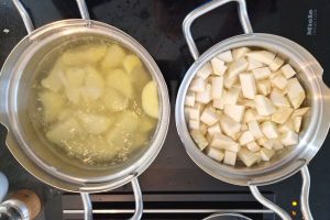 13. Een knolselderij is gemiddeld 900 gram. Pas eventueel de hoeveelheid aardappelen aan als de knolselderij iets kleiner is, zodat de knolselderijsmaak in balans blijft. Het lekkerste is als er van allebei evenveel in zit.