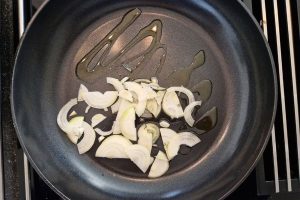 6. Snijd de ui in halve ringen en voeg toe aan de pan.