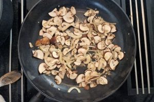 7. Maak de champignons indien nodig schoon en snijd vervolgens in plakjes. Voeg toe aan de pan samen met een klontje boter. Zet het vuur middelhoog zodat je de champignons snel bruin kunt bakken.