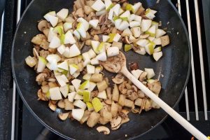 10. Snijd de peren in stukjes en voeg toe aan de pan. Bak een paar minuten mee en zet het vuur uit.